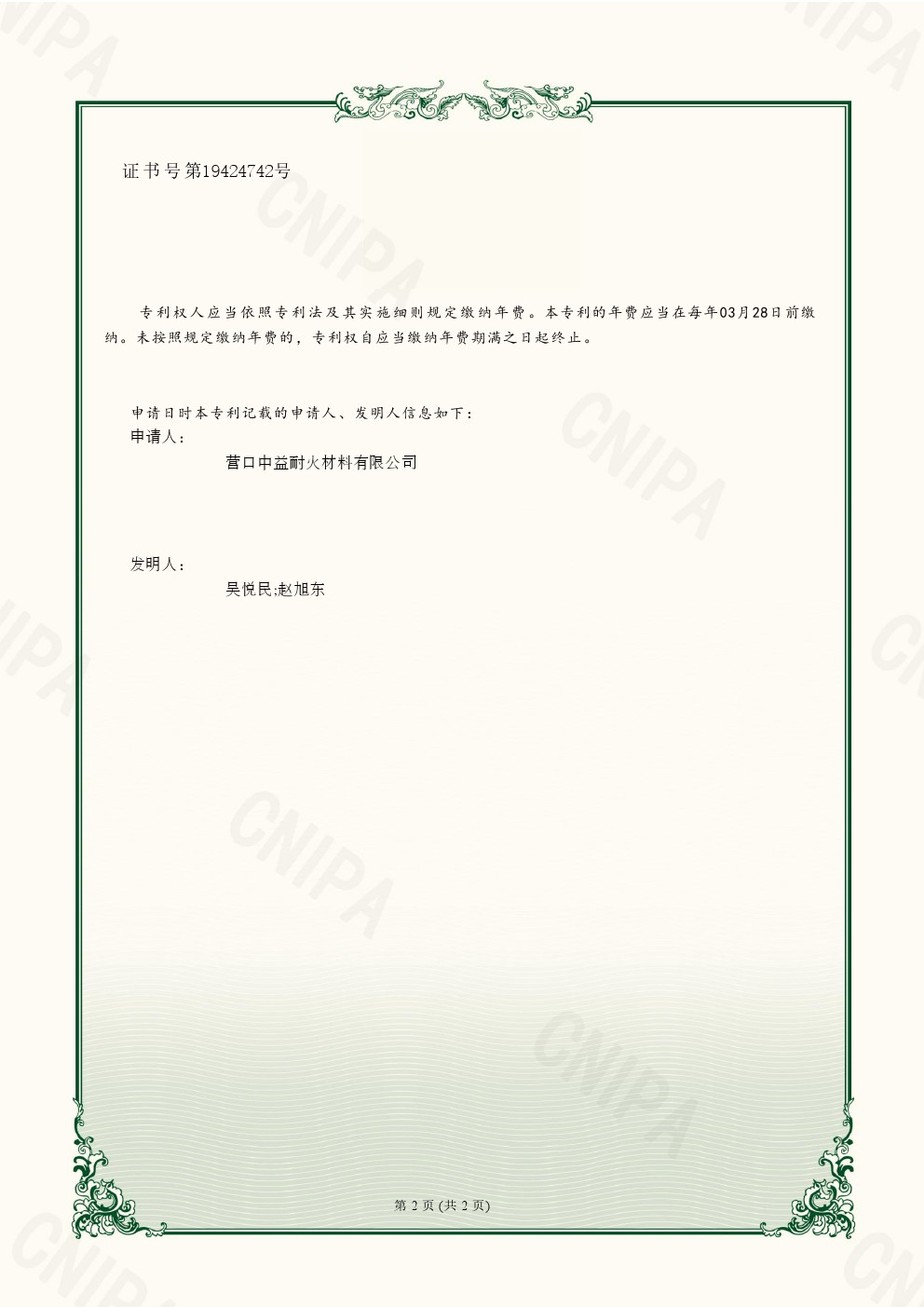 實用新型專利證書一種用于鎂碳磚生產的干燥裝置